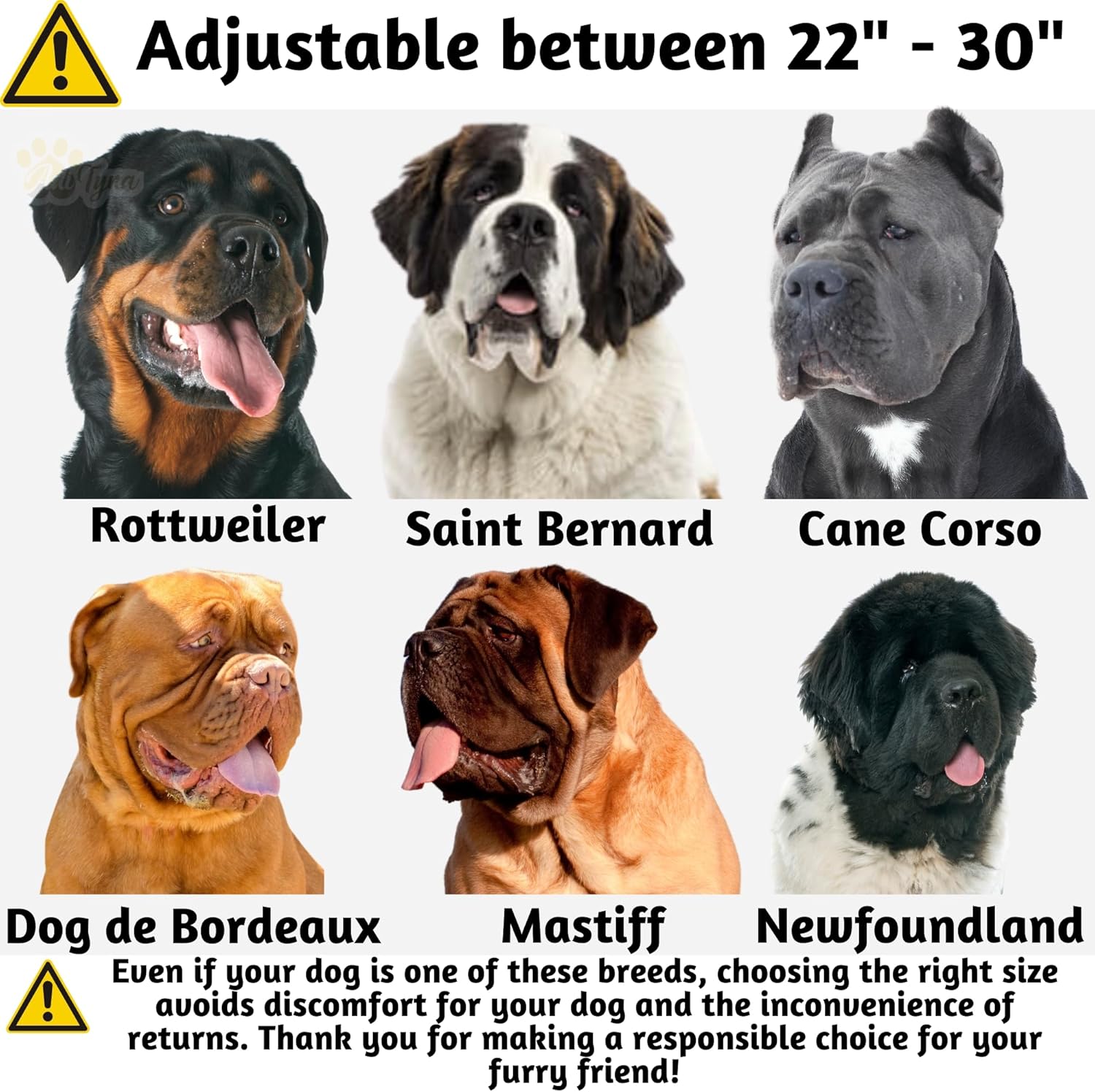 - BEST CHOICE DOG COLLAR FOR EXTRA-LARGE DOGS with a neck size between 22 to 30 inches; width is 1,5 inches; and a total length of the collar is 32 inches. Examples of extra-large dog breeds are Great Danes(150-200lb), Bernese mountain dogs(85-100lb), Rottweilers, Cane Corso, Mastiffs, Newfoundlands, and Saint Bernards. To ensure you'll receive the best-fitted size for your dog please measure his neck before choosing the size and then check the sizing table.