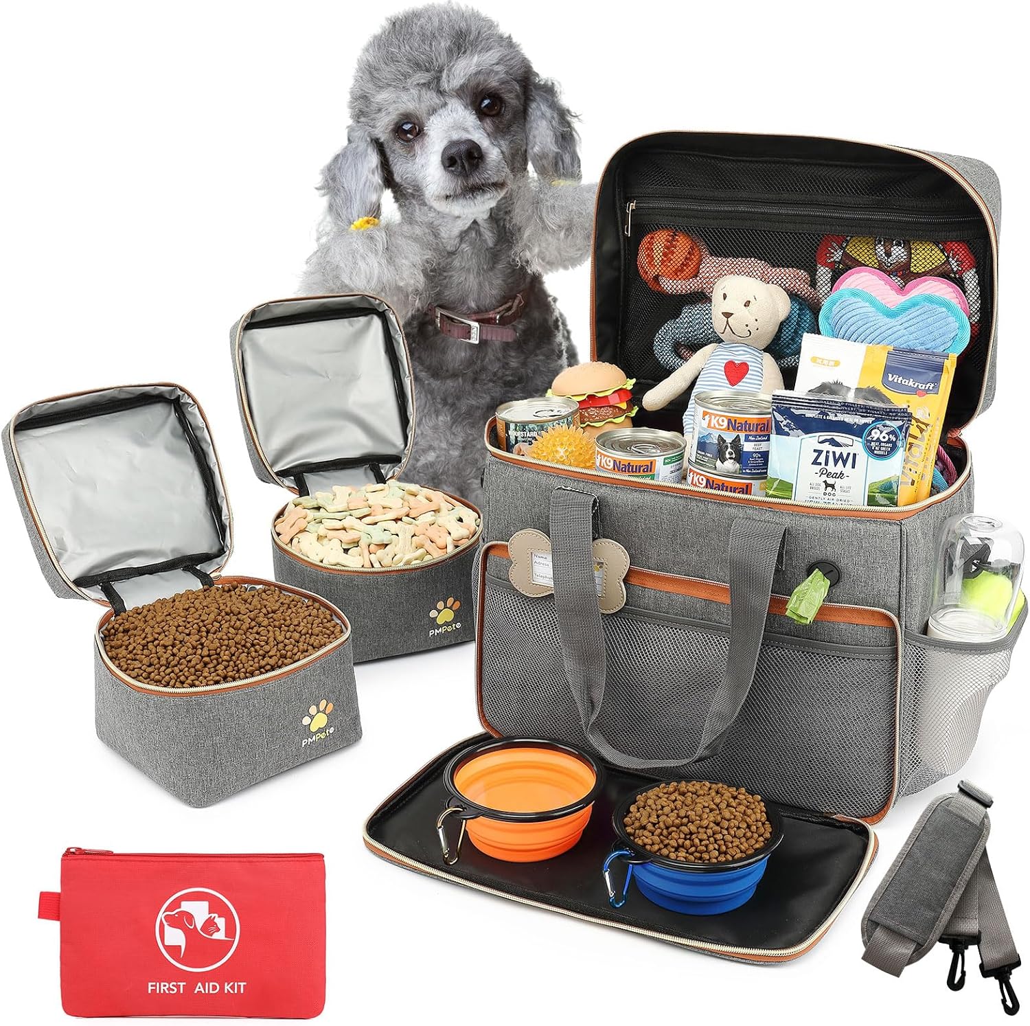 - 🐕【LARGE+THICKEN Inner Compartment】 35L Dog Bag with plenty of Pockets for Dog Supplies: There has a main compartment with the internal divider that can be added or removed based on your needs, Pmpete High-capacity bag will keep all dog essentials well-organized and within reaches, such as treats, food, toys, blanket, dog water bottle, leash/harness, food and water dog bowls, bags for waste, etc.