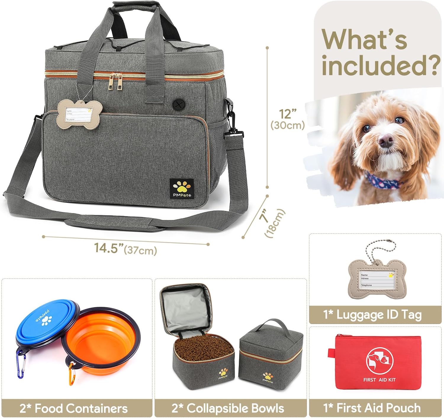 - 🐾【WHAT YOU WILL GET】1 Dog Tote bag, 2 Dog Food carriers bag, 2 Pet Silicone collapsible bowls, 1 Medical Bag, and 1 bone-shaped postcard with your dog's name and contact number. This dog travel bag dimensions is 14.5''(L)*12''(H)*7''(W), Airline Compliant and fit under seat.