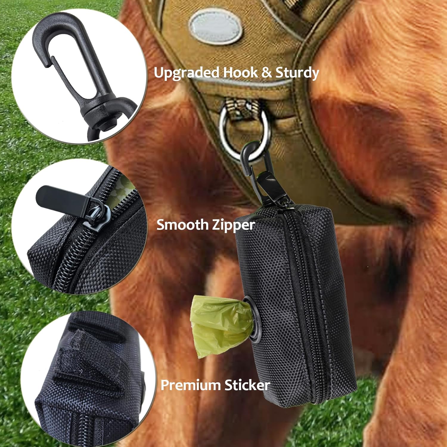- Great Poop Bag Holder: With hook and loop fastener design, you can easily attach this poop bag dispenser to any leash, harness, waist or running belt. The strong clip secures the dog bag holder, ensures it not to slide down your leash and hook & loop fastener keeps it away from annoyingly dangling. Also you can clip this dog bag dispenser on backpack or even your waistband. Enjoy relaxed walking with your doggie now