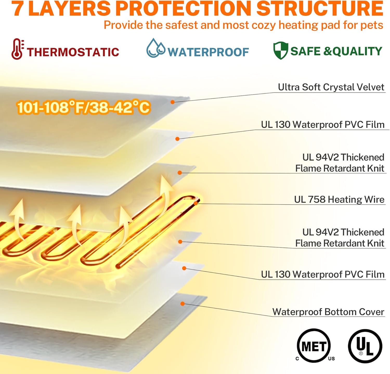 - ❤【SAFETY AND SECURE STRUCTURE】Multi-layer protection structure with UL-certified heating wire protects pets from burns. Soft PVC envelope with waterproof and flame retardant function. Built-in intelligent temperature sensor in the pet heating pad to prevent overheating and spontaneous combustion and protect your pet, which is very safe for you and your pet.