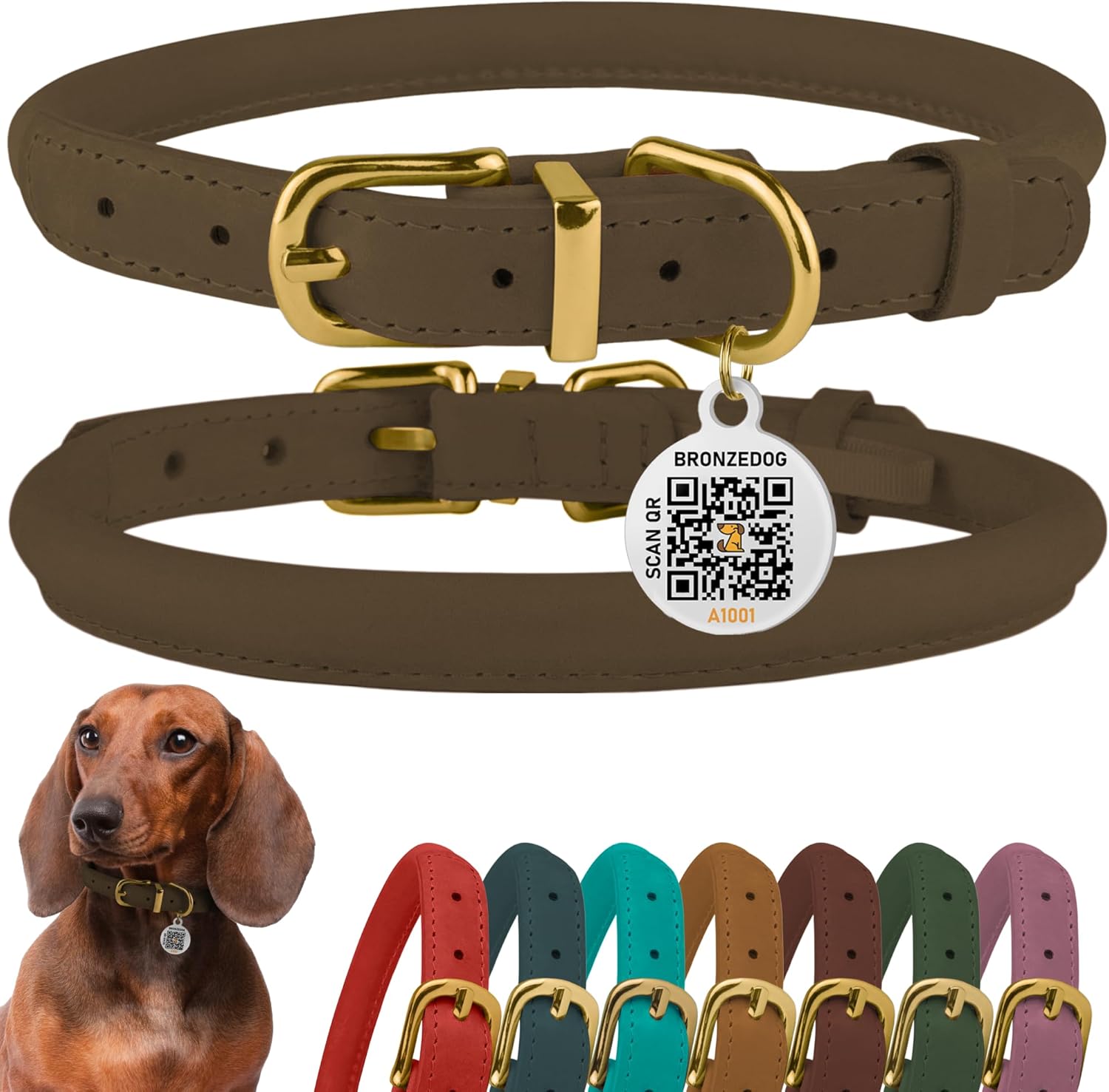 BronzeDog Rolled Leather Dog Collar with QR ID Tag, Adjustable Soft Round Collars for Small Medium Large Dogs Puppy (7" - 10" Neck Size, Nut Brown)