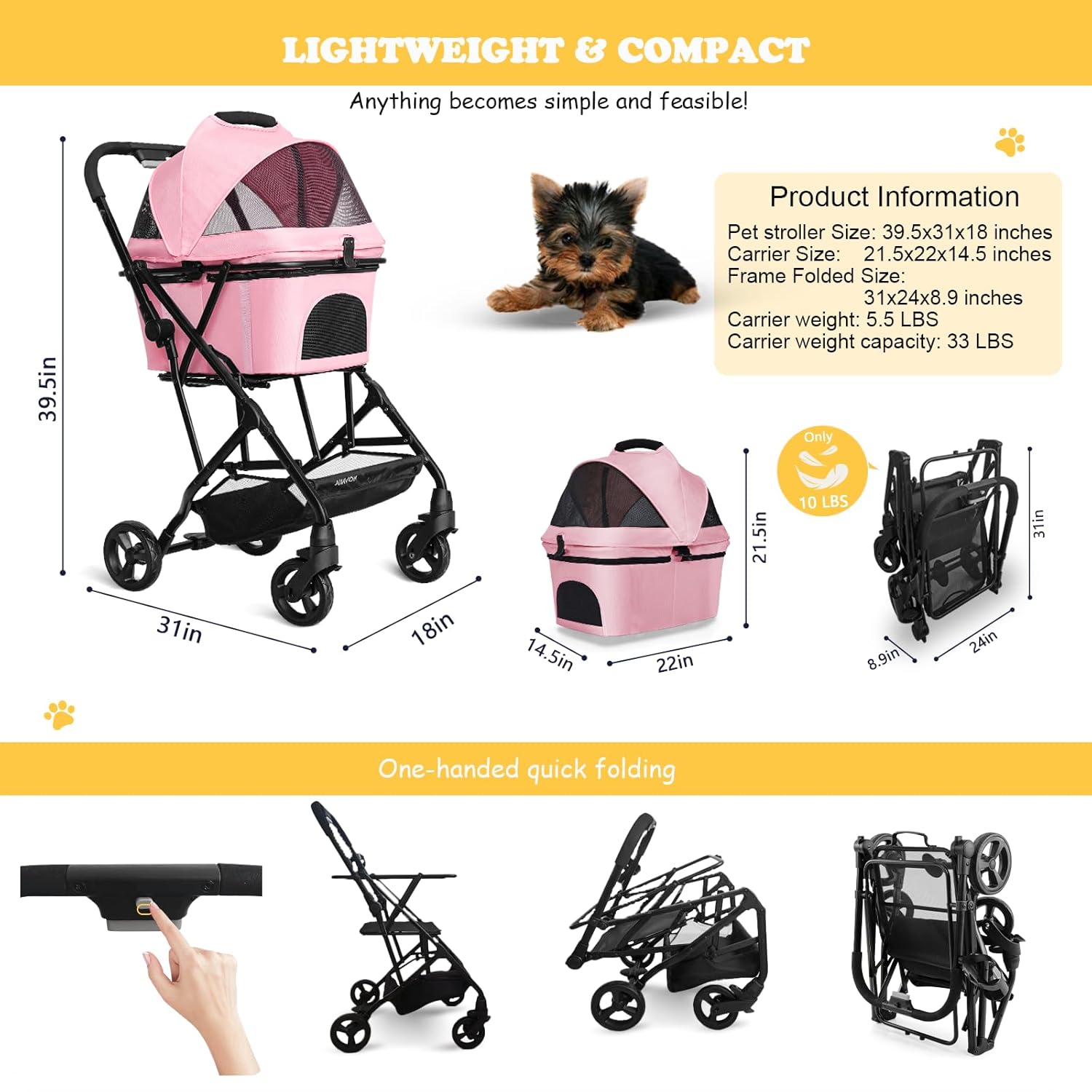 - 【EASY TO FOLD & ASSEMBLE】One-handed quick fold lightweight aluminum frame (less than 10 LBS.) and self-locking fold. Matching installation of a sweet carrying handle can easily lift the folded frame. The pet carrier is attached to the frame with snap locks for easy assembly. The large front-access storage basket provides plenty of room for toys, blankets,snacks etc.