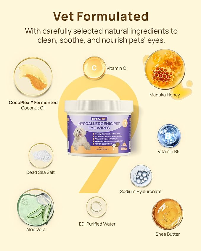 HICC PET Eyes Wipes for Dogs & Cats - Gently Remove Tear Stain, Debris, Discharge, Crust - Coconut Oil Pet Cleaning Grooming Deodorizing Wipes Wash Cleaner for Eyes, Wrinkle, Face - 100pcs