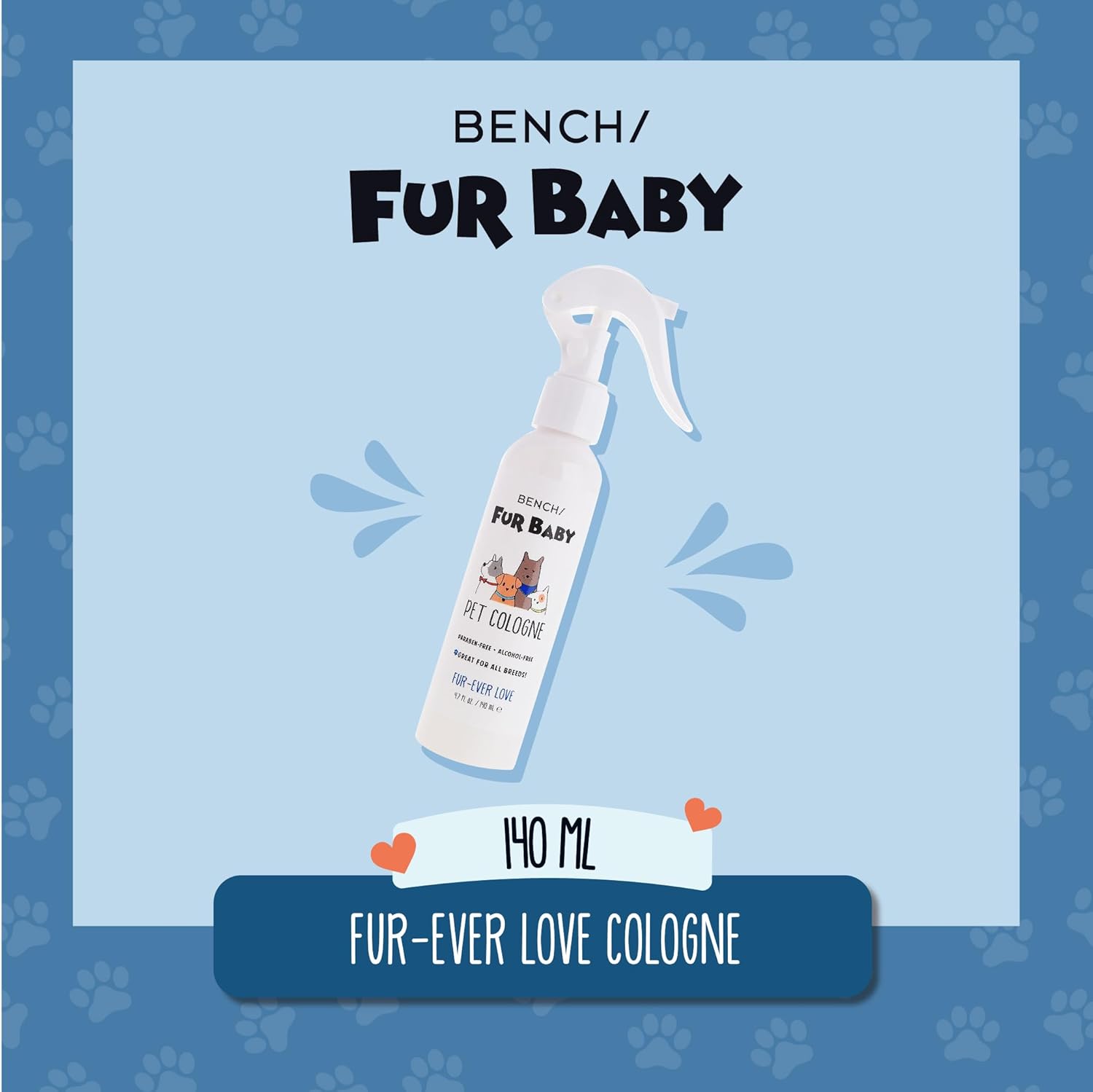 - Keep your pets fresh and clean with Bench Fur Baby Fur-Ever Gentle Pet Cologne. This alcohol-free, deodorizing cologne is specially designed to neutralize odors and refresh your furry friends between playtimes. Formulated with powerful odor eliminators, it leaves a delightful aromatic, floral, and fougere scent. Suitable for all breeds and coat types, the 140 ml / 4.7 fl oz cologne also conditions the coat for lasting freshness. Treat your pets to an uplifting grooming experience with Fur Baby Pet Cologne!