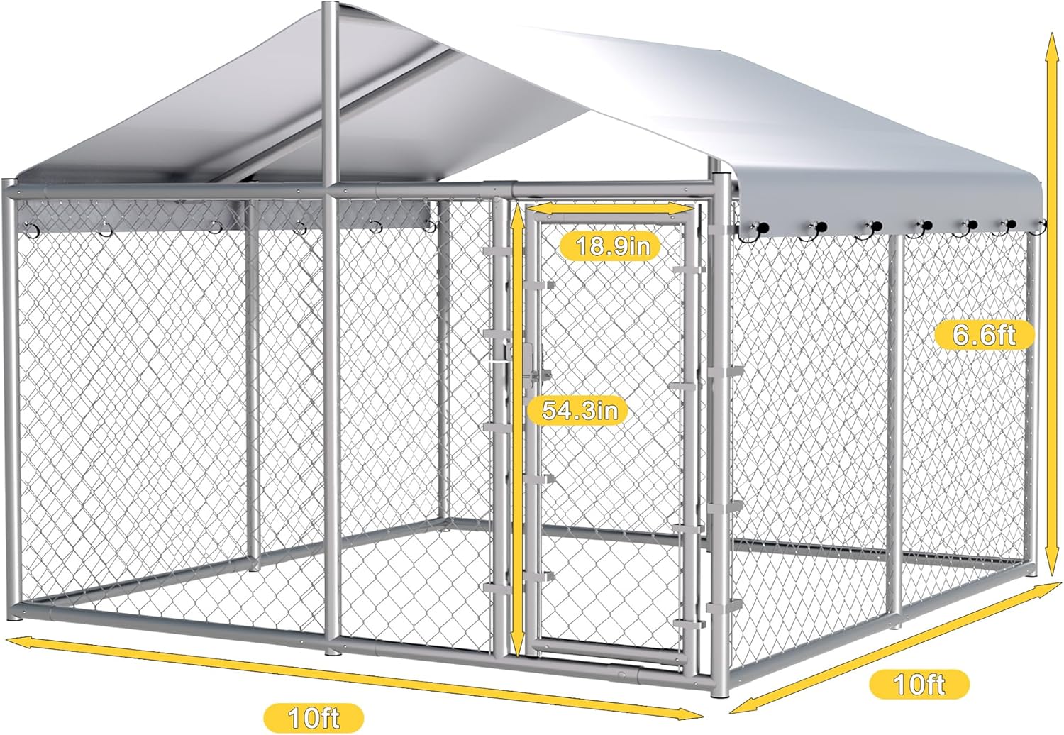 - ⛅【Covered Roof for Shade and Shelter】Our large dog enclosure includes a pitched PE tarp roof with silver coating that's UV-resistant and waterproof, providing your fur baby with a shaded, well-ventilated, and dry shelter all day long.