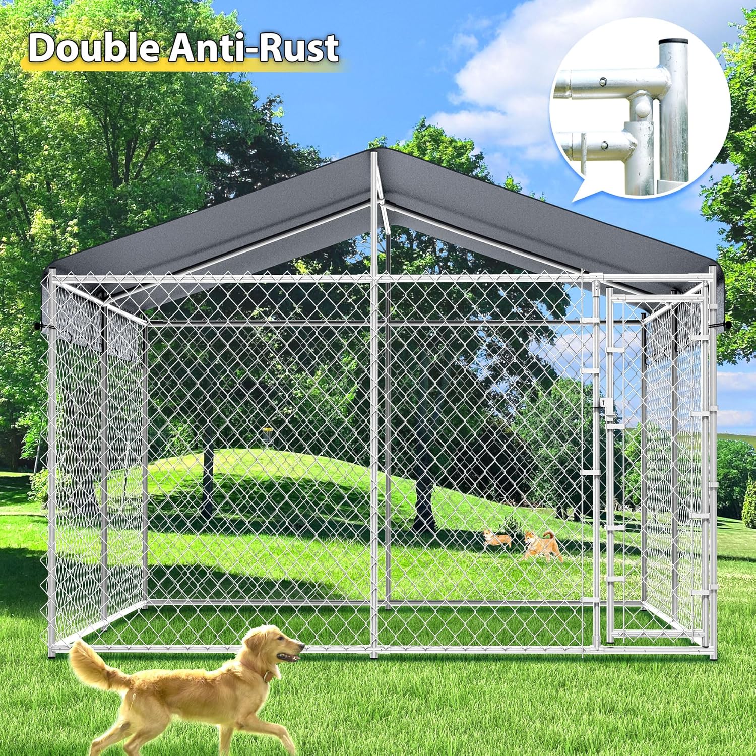 10x10ft Large Dog Kennel Outdoor, Heavy-Duty Outside Dog Kennel with Roof, Security Latch-Lock Door, Chain-Link Dog Enclosure Dog Run for Yard with Cover