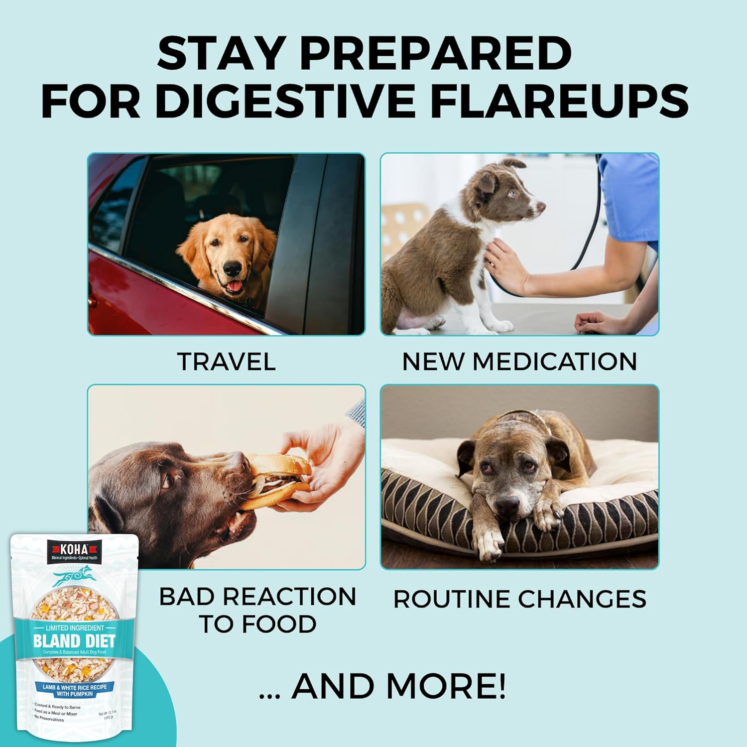- NO COOKING NECESSARY: When your vet suggests feeding your dog a bland lamb and white rice diet, there's no need to waste time cooking. KOHA Bland Diet is convenient and ready-to-serve!