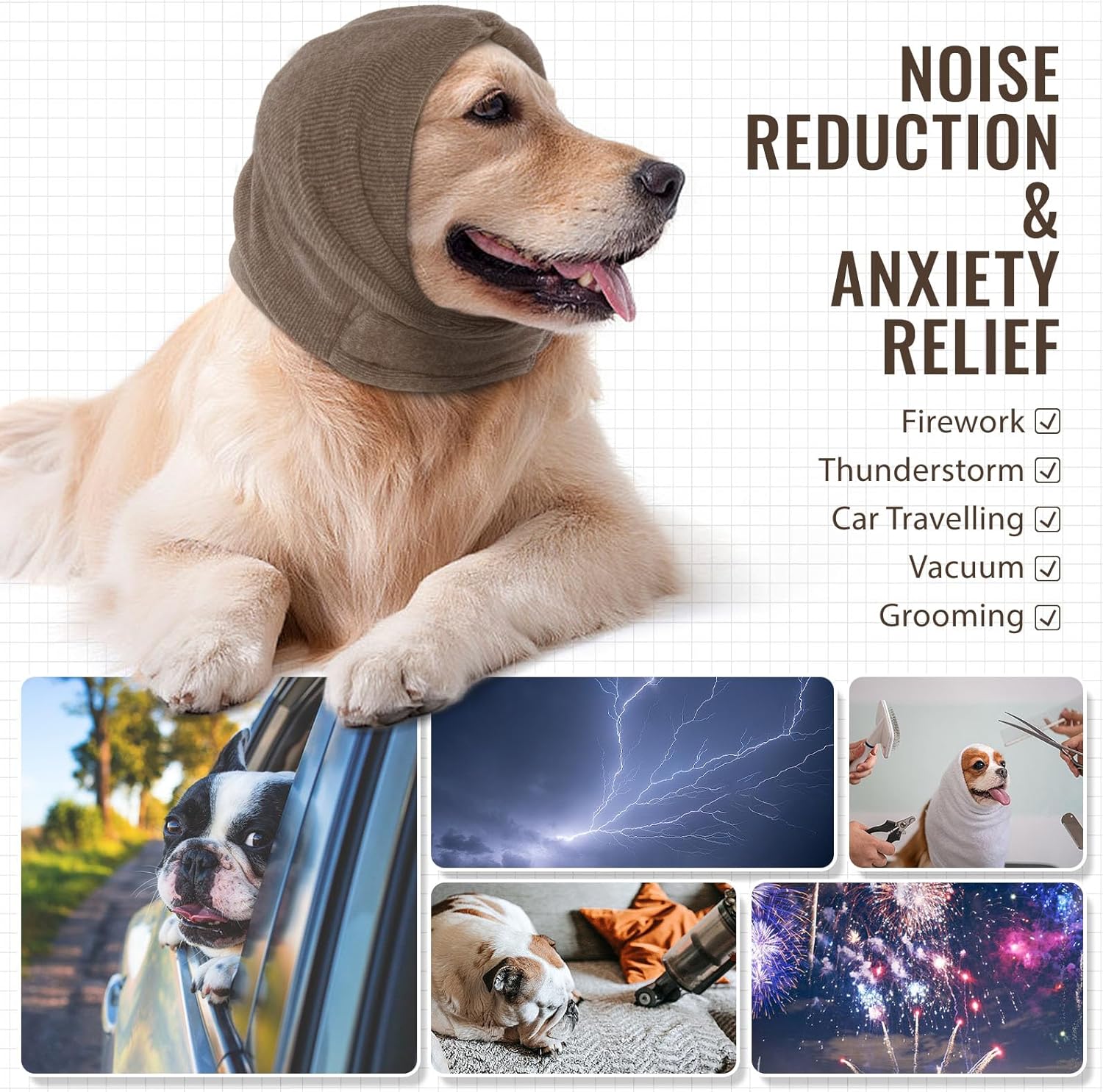 - Noise Reduction & Anxiety Relief: This dog ear cover can protect dog's hearing in high noise environments such as fireworks, thunderstorms, concerts, and family gatherings. Dog ear protector can also reduce their anxiety when car travelling, separation, grooming and vet visiting.