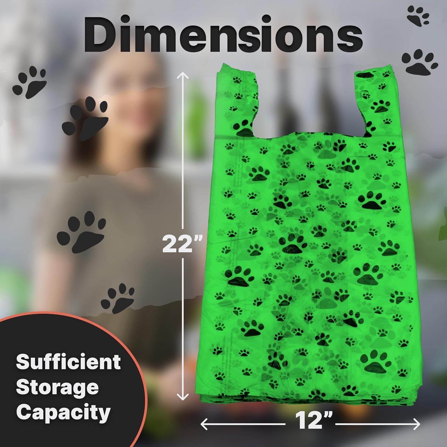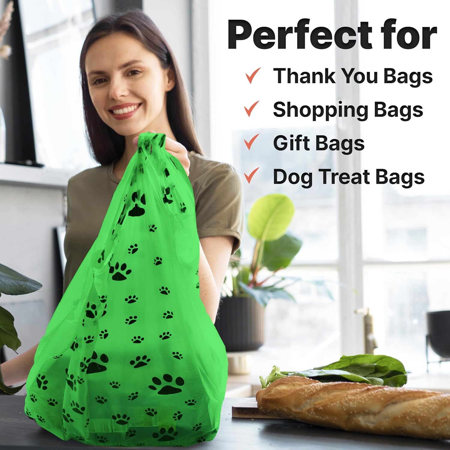 T-Shirt Bags – Paw Print Design Green Color - 100 Pack - Thank You & Shopping Bags - Cat or Dog - 22" L x 12" W x 7" Plastic