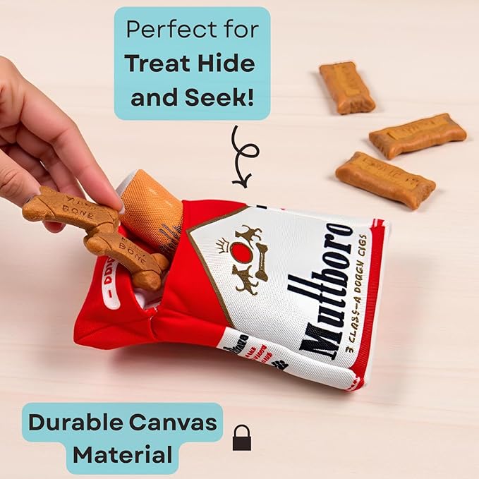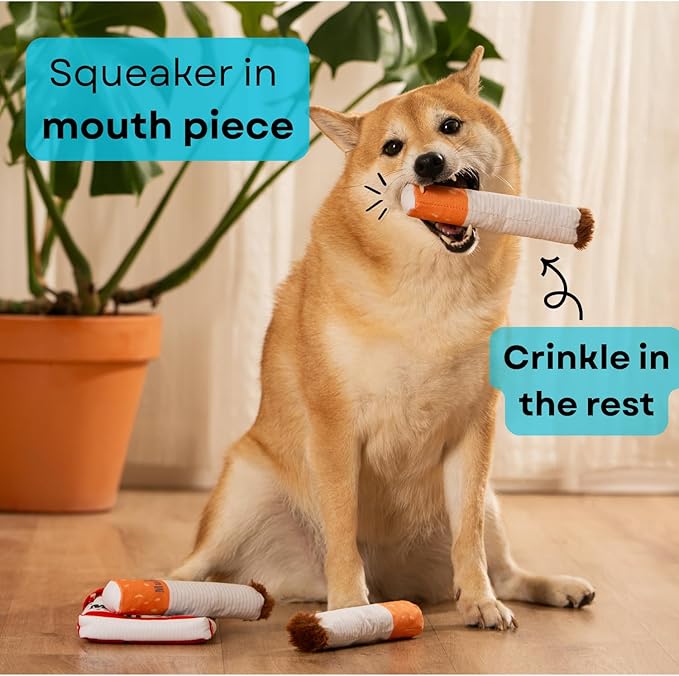 Nestpark Muttboro Doggy Cigs Funny Dog Toys - Parody Plush Squeaky Crinkle Interactive Dog Toy - Hide and Seek Treat Hiding Burrow Puzzle Toy for Stimulating Enrichment Activity