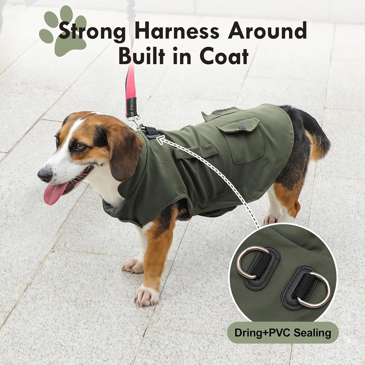 Workwear Style Dog Coats with Harness Built in for Small Dogs Windproof Warm Puppy Jacket with Storage Pockets for Cold Winter,Green L