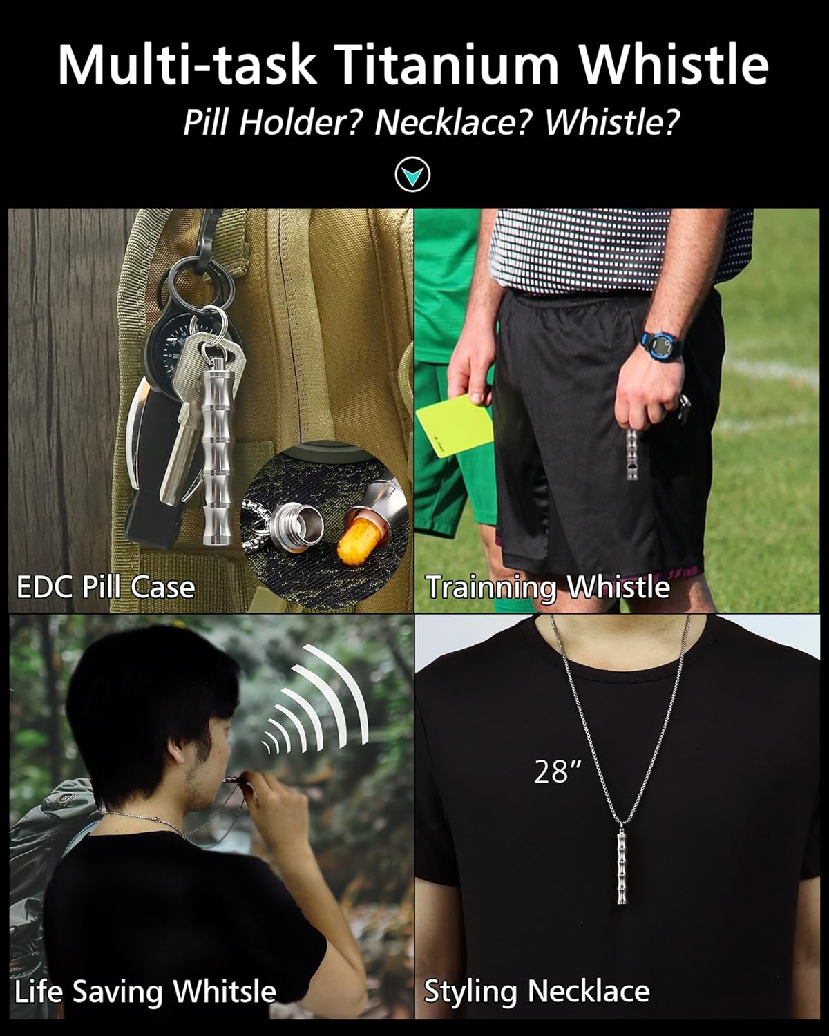 - Ultra-light High-pitch Signal Whistle: Crafted from pure titanium, this keychain whistle pill case is lightweight, about 1/3 of stainless steel. It is rust-proof, and built to last. Perfect to grab attention in emergencies, ensuring help is just a whistle away
