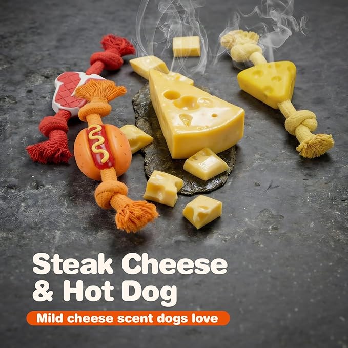 - Food Shapes Cheese Scent: Steak cheese and hot dog shapes with bright colors and a mild cheese aroma make these rope toys for dogs more engaging, encourage natural chewing and interactive play