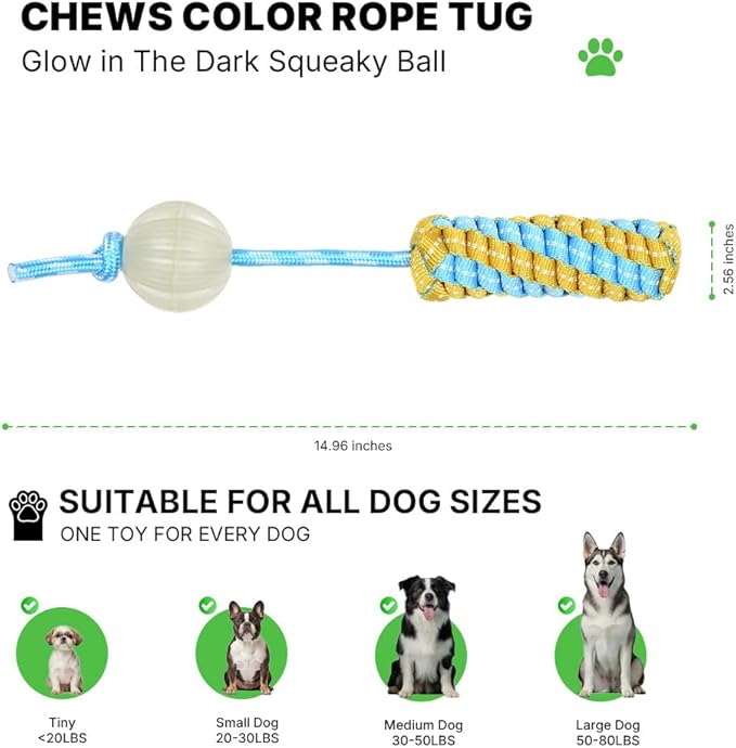 - Dual Glow & Squeak Excitement: This innovative 2-in-1 design features a glowing squeaky ball that captures your dog's attention with engaging sounds. Made from 100% natural cotton rope and non-toxic, BPA-free TPR rubber.